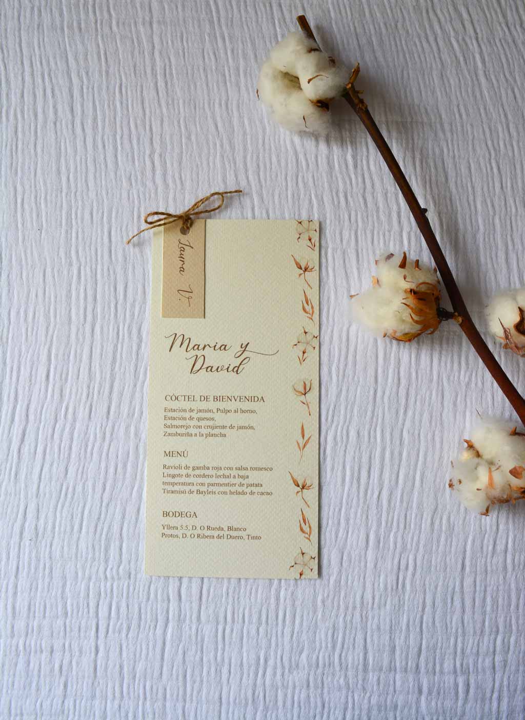 A doble cara: frase y minuta: por un lado, la frase bonita o fragmento de canción que elegís; por el otro, la minuta con el menú de la boda. Así combináis decoración y funcionalidad en un mismo elemento.